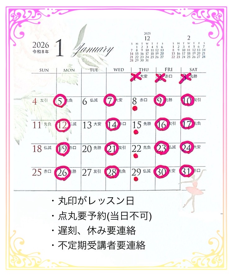 毎週、火曜日と日曜日を除いて毎日レッスンを行っていますが、変更になる場合もございますので詳しくはブログでご確認下さい。クラスの振り替え希望は前日までにご連絡ください。