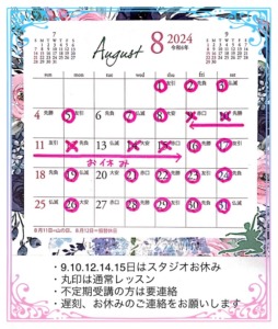 8月の予定2024年7月30日 【8月の予定】 9.10.12.14.15日はスタジオ休み。 猛暑の中、レッスンにお越しのさいはくれぐれもお気を付けください。 今月の予定Posted by premiere