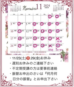 11/23(土)、29(金)スタジオお休み。
